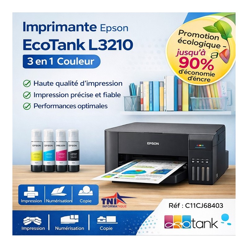 تمتع بأداء قوي واقتصادي مع طابعة Epson EcoTank L3210، الحل المثالي للمنزل أو المكتب.